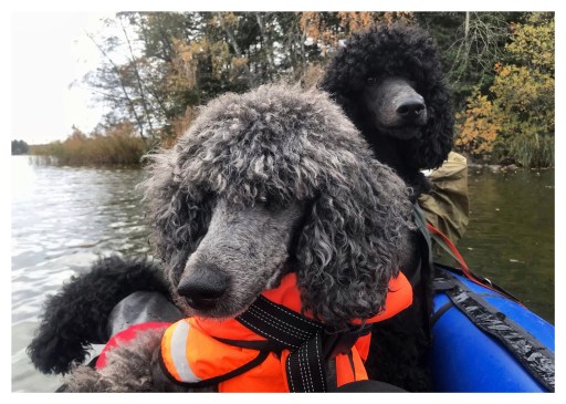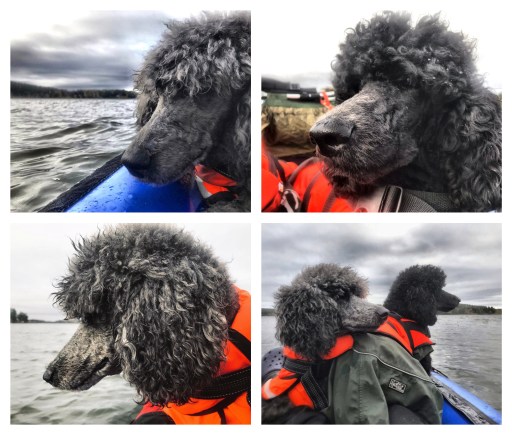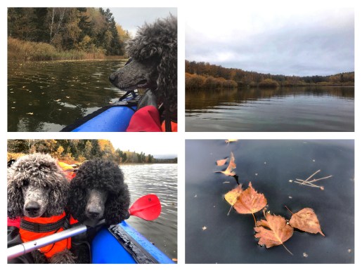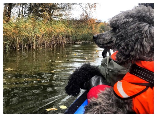 Oliver seemed pleased, he alternated between resting his head on my knee half slumbering and looking out over the lake. Charlie appeared to find the water dropping down on him from the paddle annoying, he has never liked getting wet and I can not even get him to play or cool down in water in the summer, but he eventually forgot about the water and also sat studying his surroundings.