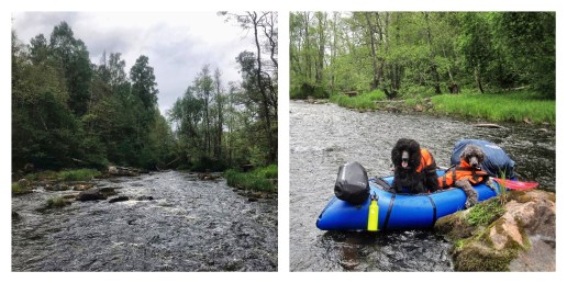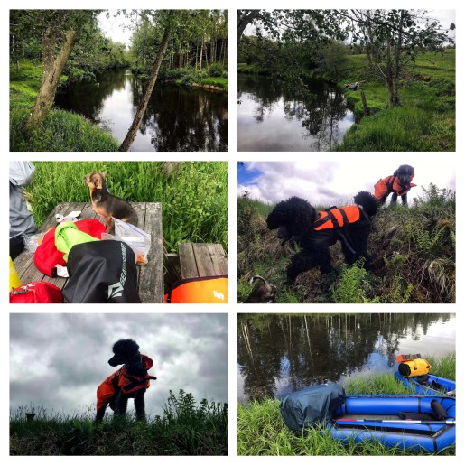 Hundar och barn fick sitta kvar i sina respektive båtar medan vi hoppade ur för att dra båtarna nerför den sista biten av strömmen och ut på lite djupare vatten. Utan oss vuxna i båtarna flöt de nerför utan några problem, så vi behövde mest bara styra förbi stenar. Charlie tyckte inte riktigt om att jag gick ur båten medan han fick sitta kvar, medan Oliver bara låg och tog det lugnt.