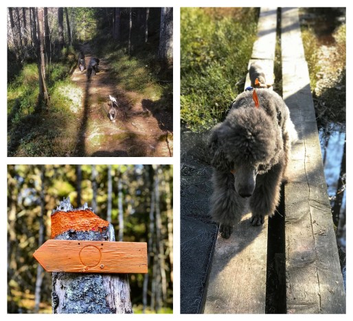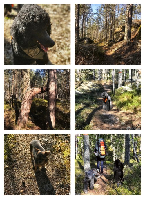 Det var en fin eftermiddag, solen lös och alla hundar var glada över att få komma ut i skogen. Jag skriver alla, för min vän hade med sig sina två hundar. Från Graversfors är det första man möter en brant backe upp i skogen, men när den väl är avklarad är det en bred och lättvandrar skogsstig som tar vid.