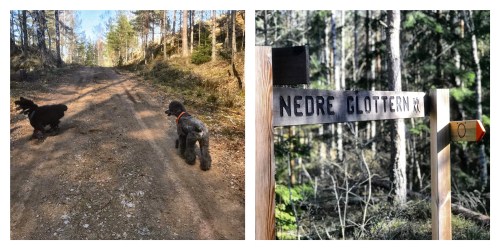 Efter en stund leder stigen fram till en skogsväg. Där fick Charlie pudelfnatt och sprang runt som en galning medan han försökte få de andra hundarna att leka med honom. Från skogsvägen tar man sedan av på en stig där skyltar strax visar mot sjöarna Övre Glottern och Nedre Glottern.