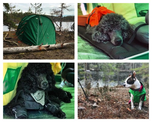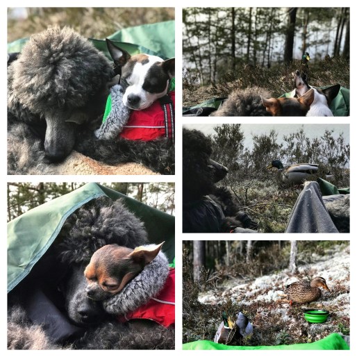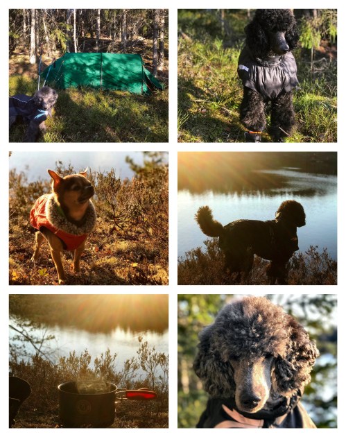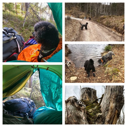 When it began to get dark and cold, we retreated to the tent, and discovered through social media that a mutual acquaintance was spending the night at the shelter we had tried to find. He found us, and we spent the evening talking and having a few drinks while the dogs slept. Well, everyone except for Charlie. During the evening he wanted to go outside and when I called him back he did not come. We could hear him moving around outside the tent, so we let him be. Charlie is the kind of dog who would never dream of going anywhere. But after a while he suddenly came crashing into the side of the tent, as if he had decided to try and walk straight through the wall, but when I called for him to come in through the vestibule he still would not come. It turned out that he had managed to get himself caught in the guy lines, and him crashing into the tent was probably a result of stumbling into the guy line. It is very strange however, how the dog who normally cries like a baby when a small stick gets caught in his fur did not make a sound when getting completely tangled up in a guy line.