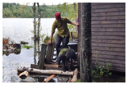 När vi nästan var framme vid vindskyddet upptäckte vi att leden blivit översvämmad. Det var så mycket vatten att det inte gick att gå runt, och när vi gick igenom så rann vattnet in över skaftet på mina höga kängor. Charlie var föga imponerad. Situationen blev inte bättre när vi kom fram till vindskyddet. I mörkret kunde vi se att det stod helt i vatten, men vi kunde höra att det fanns människor i vindskyddet.