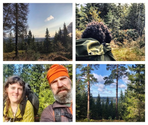 Efter kanske en dryg halvtimme fortsatte vi vidare genom skogen. Vi kom fram till en grusväg, och därifrån ledde en stig upp oss till en utsiktsplats med ett torn. Där mötte vi en familj som var ute och plockade svamp, och föräldrarna satt nedanför medan tonåringarna klättrade upp i tornet. Vi satte oss ner en kort stund för att dricka vatten och växla några ord innan vi fortsatte.