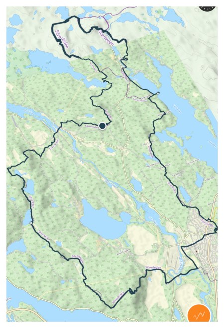 Eventually we reached a shelter up on a hill overlooking Hällefors. We stopped there to rest and have a fika, before we continued down towards civilisation. The trail followed paths and roads beforee we reached a beautiful wetland with a long a footbridge. After we soon reached paved roads and the enrtyway to a park leading us into Hällefors.