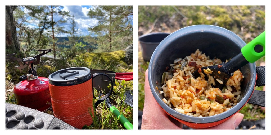 We found a spot with a view of Åkerkvisten where we sat down to have lunch. I have always struggled with the freeze dried meals you can buy for hikes, and so I had bought a book with recipes on making my own meals with dry ingredients either I can buy in stores or dry myself and that I only had have to pour hot water over when out on the trail. My homemade tomato risotto was definitely better than any freeze dried meal I have ever bought.