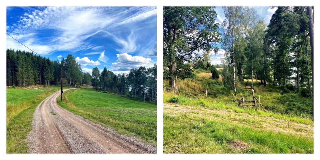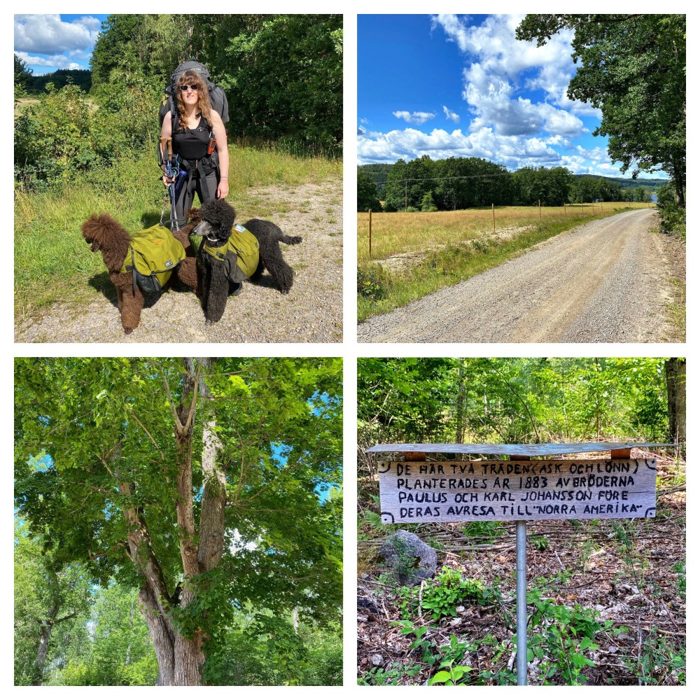 Det är också en ganska så bra summering av första dagen på Tjustleden. Vi började vår vandring strax utanför Falerum på en grusväg som vi blev avsläppta på av min pappa som snällt ställde upp som chaufför. Vägen slingrade sig fram mellan skog och hagar, och ibland kunde sjön Åkervristen skymtas. När vi passerade en rödmålad liten gård stod det två ståtliga träd, en ask och en lönn, precis intill vägen med en skylt som berättade att träden planerats av två bröder, Paulus och Karl Johansson, innan de for till Amerika 1883. Det kändes lite andaktsfullt att stå och beskåda de två träden och jag undrade hur det hade gått för de två bröderna.