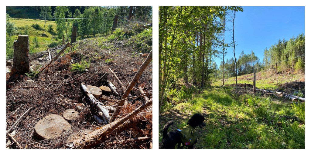 It was going to be a very warm day, and we had a long hike ahead of us. I therefore decided to get an early start, but first we had to cross the pasture again to reach the gravel road. It all went well this time, and so we continued our hike along the road until we reached a forest path. We did however not get to enjoy the forest for long becasue we soon reached a huge clear felling.