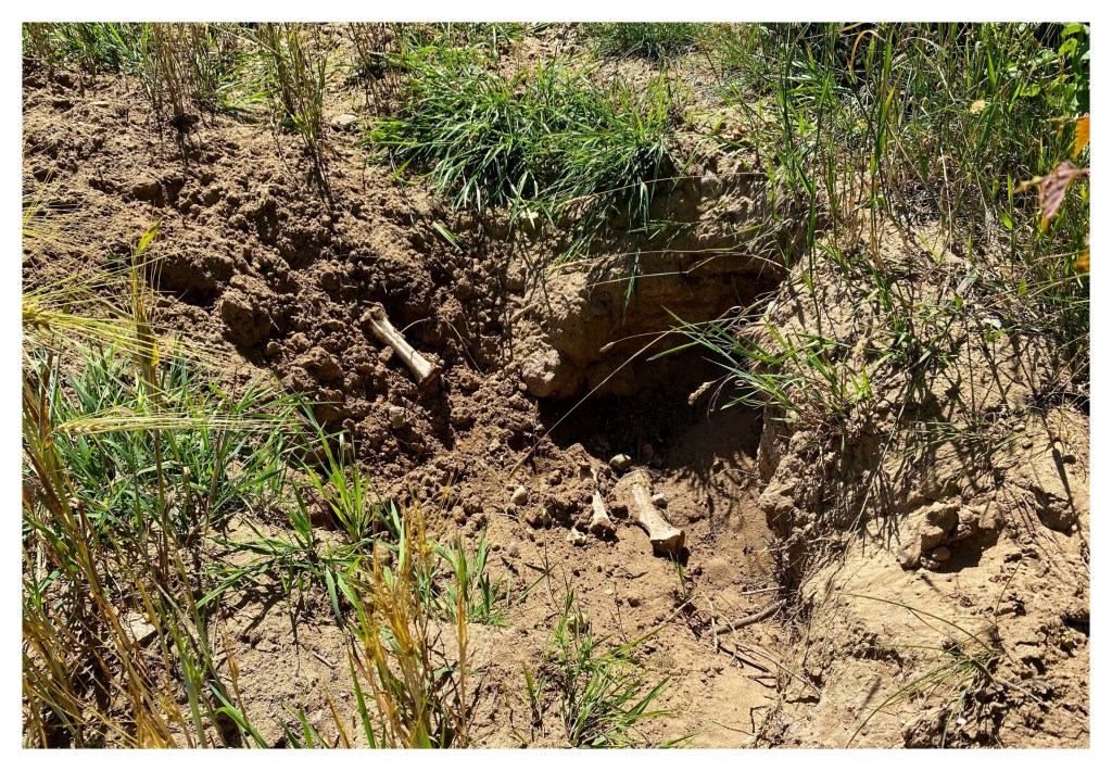 Det gick bra, men på kartan såg det ut som att risken var stor att vi snart skulle behöva gå igenom mer betesmark. Jag bestämde mig då för att gena genom skogen till den väg som leden skulle leda ut till. Det var lättare sagt än gjort, för det fanns inga stigar, vegetationen var bitvis tät, och det låg taggtråd halvt dold lite här och var. Det tog närmare 40 minuter att gå knappt 500 meter. Men i kanten av en åker gjorde vi ett intressant fynd, en grop med ben som någon hade grävt upp.